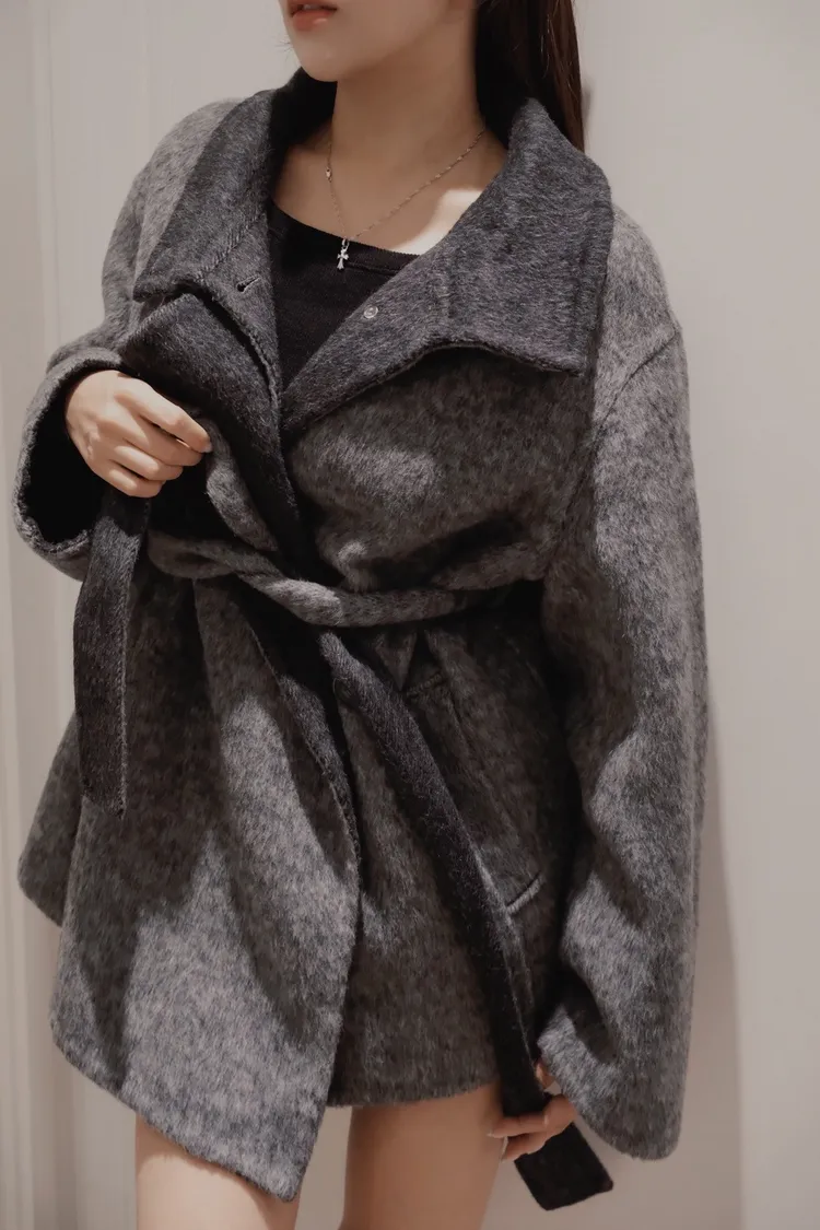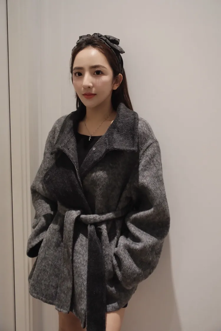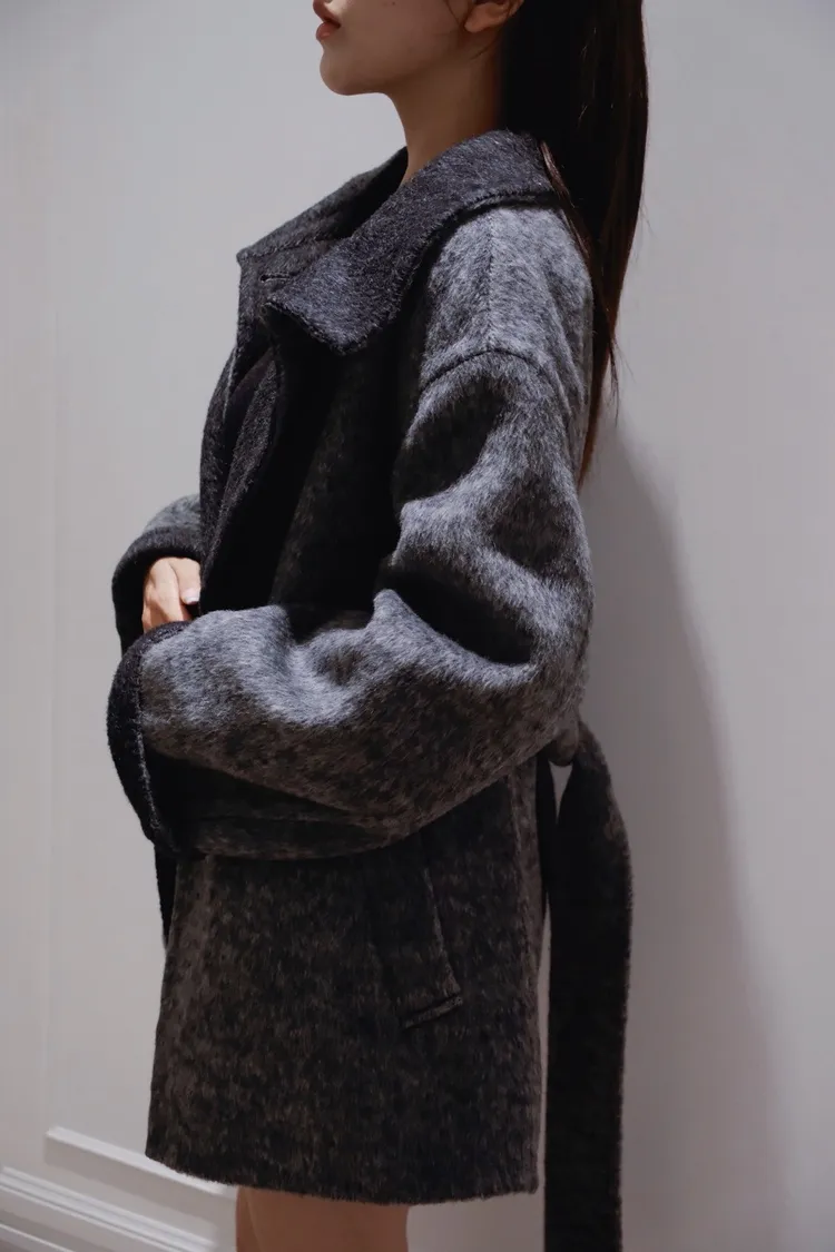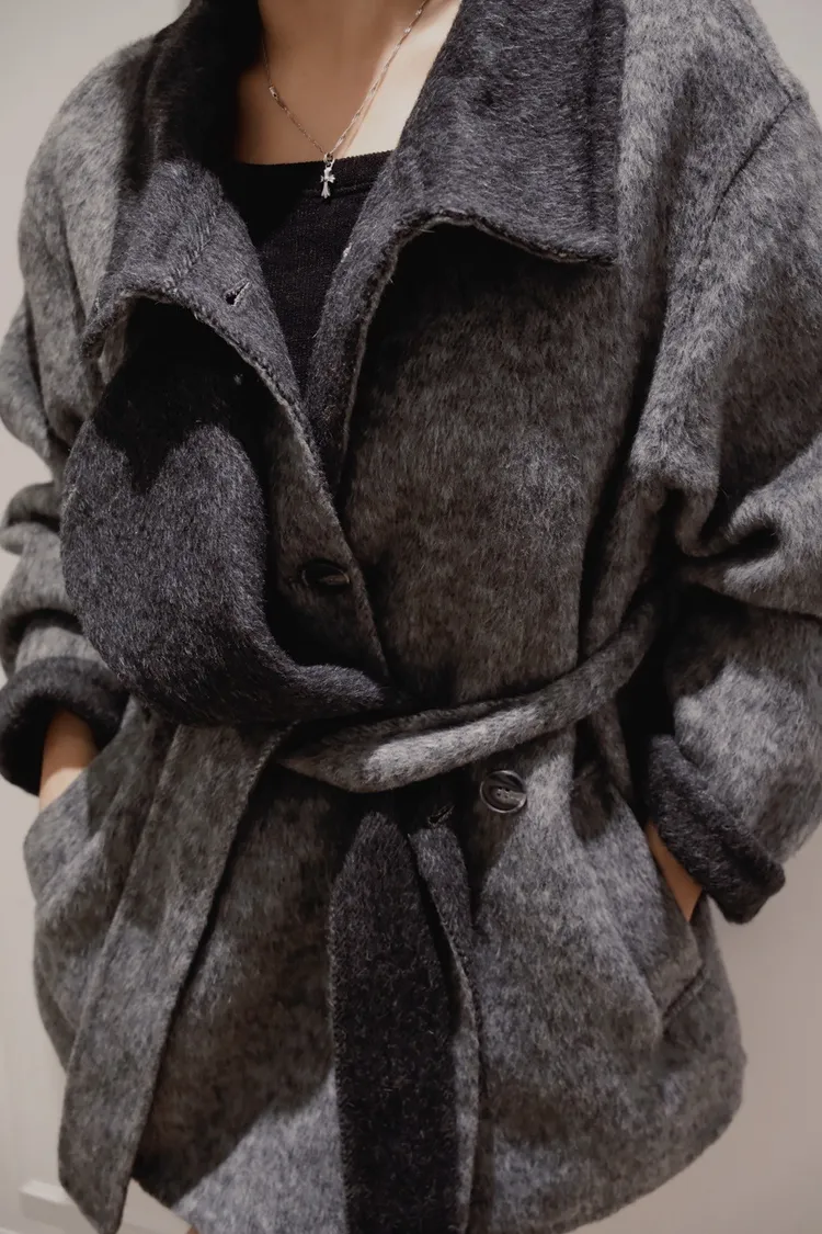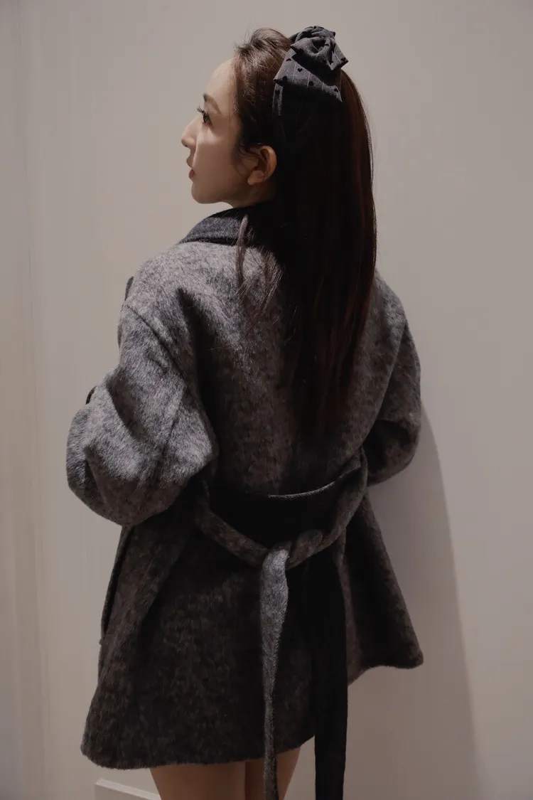 深灰拼黑連衣裙羊絨大衣